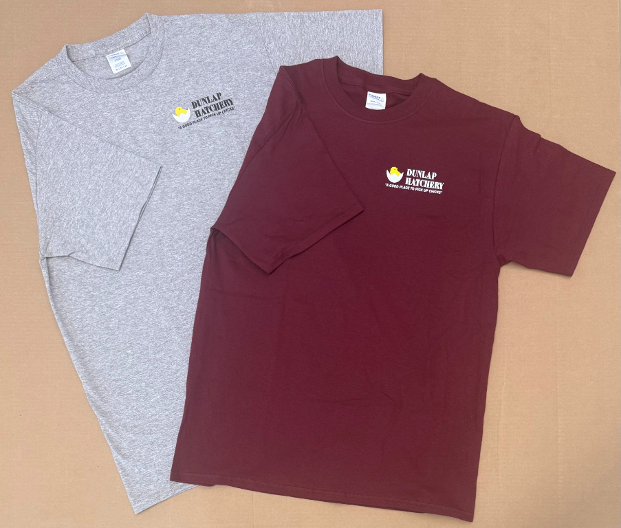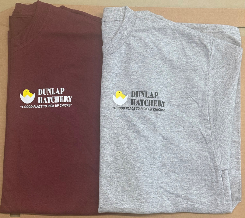 Dunlaps’ very popular logo is now available on a T-shirt. “A Good Place To Pick Up Chicks” along with our chick logo is put on a quality 50/50 shirt made by Hanes. Shirts come in maroon or light gray. Specify color and size S-XL.