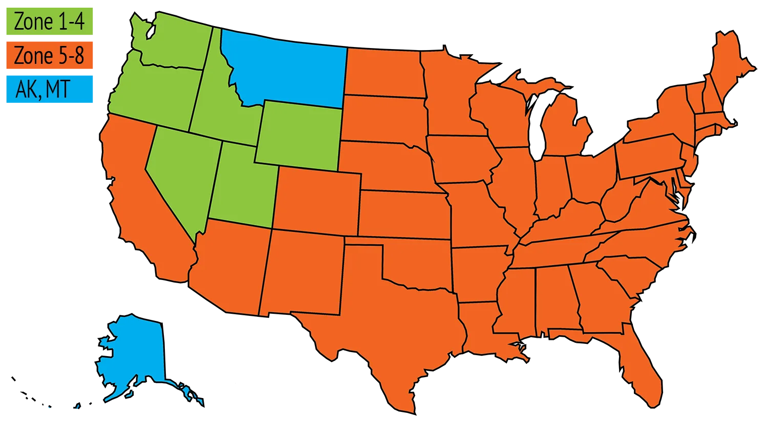 For local pick-up, Alaska or Montana orders please choose Instore, AK & MT. For Washington, Oregon, Idaho, Wyoming, Nevada and Utah, choose Zone 1-4. All other states choose Zone 5-6.